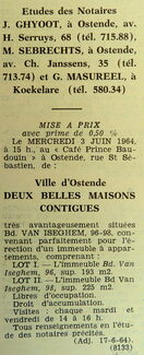 Advertentie : Etudes des notaires J. Ghyoot, M. Sebrechts et G. Masureel. Vente publique. Deux belles maisons contigues. Bd Van Iseghem 96-98, Ostende