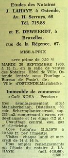 Advertentie : Etudes des notaires J. Lahaye et E. Deweerdt. Vente publique. Immeuble de commerce "Cafe NOVA Pension". Situé Mariakerkelaan, Distellaan 60, coin Schermplantenstraat