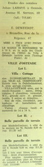 Advertentie : Etudes des notaires J. Lahaye et E. Deweerdt. Vente publique. Lot I : Villa-Cottage. Duinhelmstraat 25. Lot II et III : Parcelle de terrain. Madeliefjeslaan