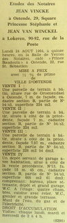 Advertentie : Etudes des notaires Jean Vincke et Jean Van Winckel. Vente publique. Vente I, II et III : Parcelle de terrain à bâtir. Vente IV : Un dépôt servant de garage avec habitation. Rue de Groenendael 13, Ostende