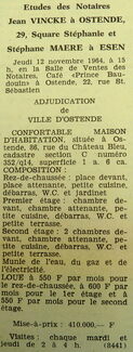Advertentie : Etudes des notaires Jean Vincke et Stéphane Maere. Vente publique. Confortable maison d'habitation. 86, rue du Château Bleu, Ostende