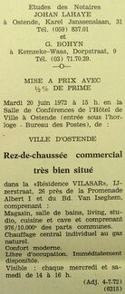 Advertentie : Etudes des notaires Johan Lahaye et G. Bohyn. Vente publique. Rez-de-chaussée commercial. Résidence Vilasar. Ijzerstraat 26