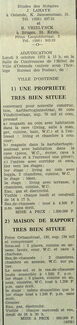 Advertentie : Etudes des notaires Johan Lahaye et R. Vrielynck. Vente publique. I : Une propriété très bien située. Aartshertoginnestraat 60. II : Maison de rapport. Frère-Orbanstraat 130