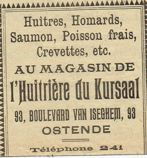Advertentie : Huîtres, Homards, Saumon... au magasin de l'Huîtrière du Kursaal. 93, Boulevard Van Iseghem, Ostende
