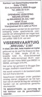Advertentie : Kantoor van gerechtsdeurwaarder Eddy Vynck : Openbare verkoping op 20 juli 1987 van het vissersvaartuig "Breugel" Z.507