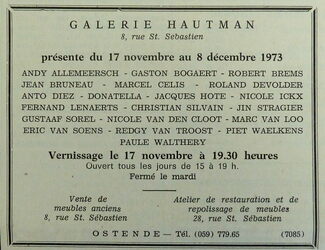 Advertentie : Kunsttentoonstelling. Galerie Hautman. Sint-Sebastiaanstraat 8. 17/11-08/12/1973