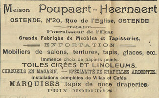 Advertentie : Maison Poupaert-Heernaert. Grande fabrique de meubles et tapisseries. 20, Rue de l'Eglise, Ostende