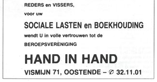 Advertentie : Reders en vissers, voor uw sociale lasten en boekhouding wendt u in volle vertrouwen tot de beroepsvereniging Hand in Hand, Vismijn 71, Oostende, tel 32 11 01