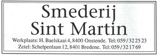 Advertentie : Smederij Sint Martin. - Werkplaats : H. Baelskaai 4, 8400 Oostende, tel 059 / 32 25 23. - Zetel : Schelpenlaan 12, 8401 Bredene, tel 059 / 32 17 69