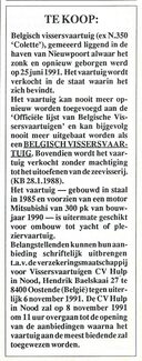 Advertentie : Te koop : Belgisch vissersvaartuig (ex N.350 ''Colette''), gemeerd liggend in de haven van Nieuwpoort alwaar het zonk en opnieuw geborgen werd op 25 juni 1991. Het vaartuig wordt verkocht in de staat waarin het zich bevindt...