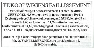 Advertentie : Te koop wegens faillissement : Vissersvaartuig, in toestand zoals het zich bevindt, Zeevogel N.599, gebouwd in hout, bouwjaar 1964 in Zeebrugge door J. Haerynck, vermogen 225 PK, lengte 21 m, breedte 5,60 m...