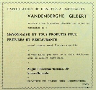 Advertentie : Vandenberghe Gilbert. Exploitation de denrées alimentaires. August Beernaertstraat 30, Stene-Oostende