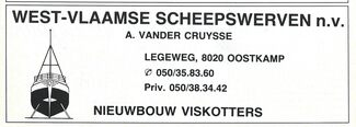 Advertentie : West-Vlaamse Scheepswerven NV. - A. Vander Cruysse, Legeweg, 8020 Oostkamp. - tel : 050 / 35 83 60, priv. : 050 / 38 34 42. - Nieuwbouw viskotters