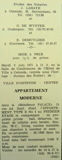 Advetentie : Etudes des notaires J. Lahaye, O. De Wynter et R. Demuylder. Vente publique. Appartement moderne nr.4, 1er étage. Résidence "Palace". 19, rue Ad. Buyl