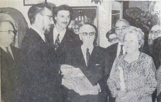 Foto : De heemkundige kring De Plate viert hun voorzitter en stichter Ernest De Taye. Omer Vilain, stadsbibliothecaris en secretaris van de kring overhandigt een geschenk aan de voorzitter en zijn echtgenote. Op de foto o.a. : Gilbert Vermeersch en schepen Raymond Miroir.
