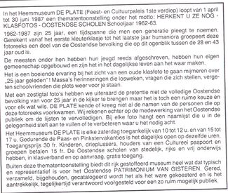 In het Heemmuseum De Plate (Feest- en Cultuurpaleis 1ste verdiep) loopt van 1 april tot 30 juni 1987 een thematentoonstelling onder het motto : Herkent u ze nog : klasfoto's Oostendse scholen, schooljaar 1962-63...