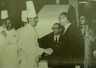 Foto : De heer Roger De Ramée feliciteert de winnaar "Beste Kok van België 1971" Jean-Marie Daue uit Oostende. Recept : Kalfsnoot