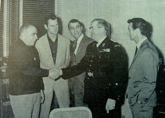 2 foto's : (1) Maurice Boutel schudt de hand van hoofdpolitiecommissaris Pierre Beauprez en (2) acteur Hubert Noël en politieagent Dasseville