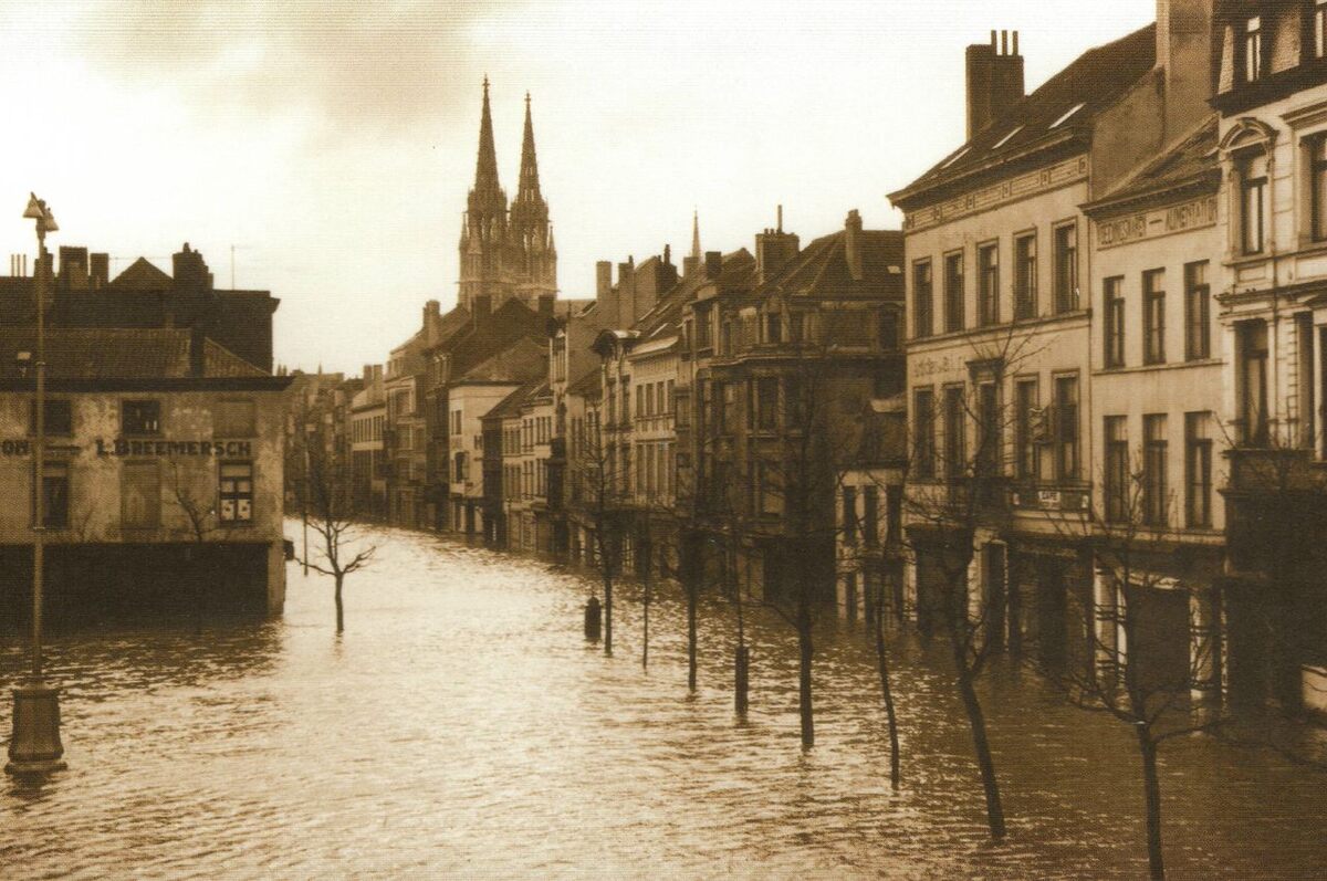 Tropic T 387. - Ostende oender woater 1953. - De Groentemarkt en rechtdoor, de Kaaistraat. Op de achtergrond, de torens van de Sint Petrus en Pauluskerk