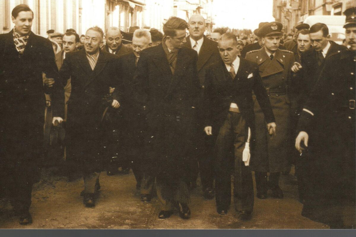 Tropic T 396. - Ostende oender woater 1953. - Koning Boudewijn bezocht onze stad in het gezelschap van het stadsbestuur op 03/02/1953. Koning Boudewijn in gesprek met burgemeester Adolf Van Glabbeke. Tweede van links, Oscar Behogne, minister van Openbare Werken, naast Jan Piers.
