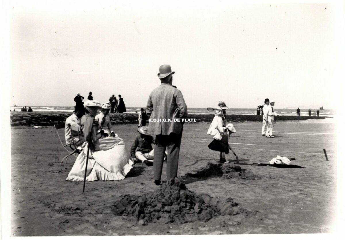 Formaat : 12,5 x 17,5 cm. - Het Groot Strand en op de achtergrond een golfbreker. Tijdens de Belle Epoque genoot men in zondagse kledij van zijn vakantie op het strand. Ook de kinderen, en zij hadden niet veel keuze, een emmertje, een schepje en een vlaggetje.