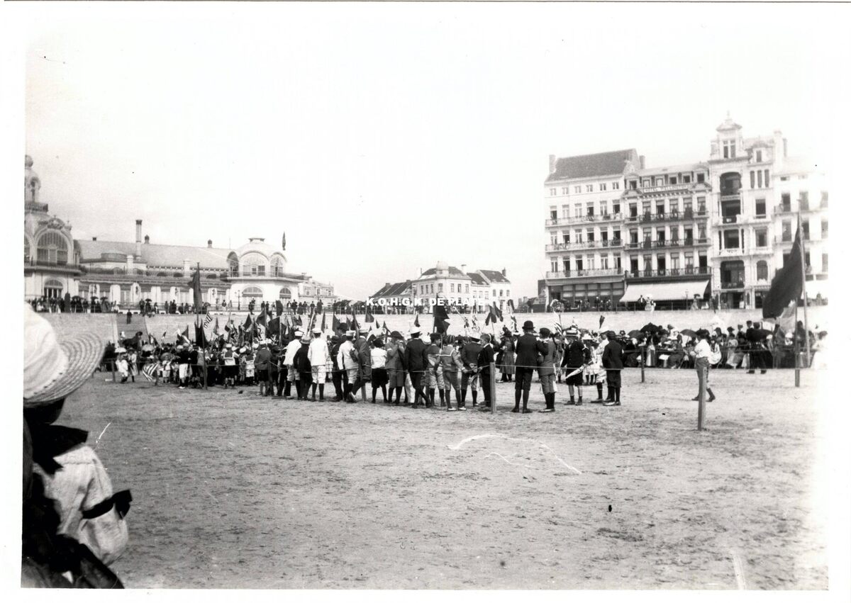 Formaat : 12,5 x 17,5 cm. - Onbekend evenement op het Groot Strand tijdens de Belle Epoque. Op de achtergrond, de grote hotels en een gedeelte van de westgevel van het tweede Kursaal langs de Zeedijk.