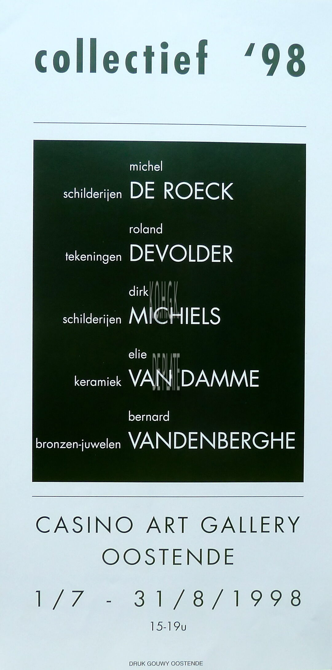 Formaat : 50 x 25 cm. Michel De Roeck, schilderijen ; Roland Devolder, tekeningen ; Dirk Michiels, schilderijen ; Elie Van Damme, keramiek ; Bernard Vandenberghe, bronzen-juwelen