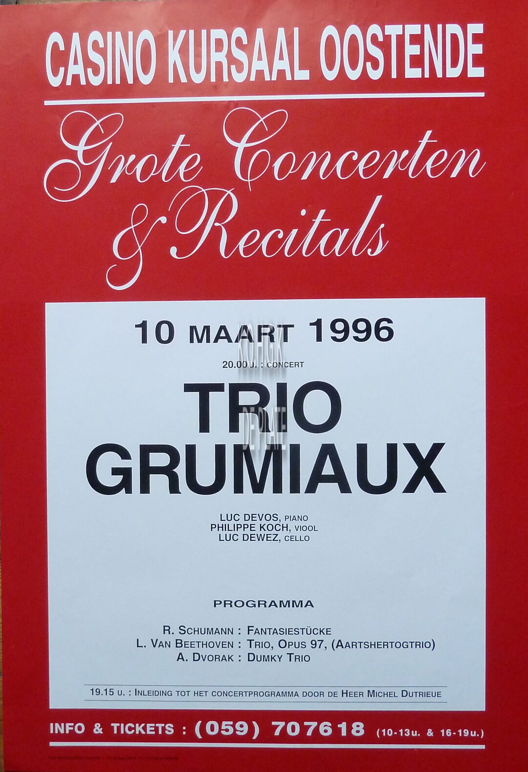 Affiche : 60 x 42 cm. - Luc Devos, piano ; Philippe Koch, viool ; Luc Dewez, cello