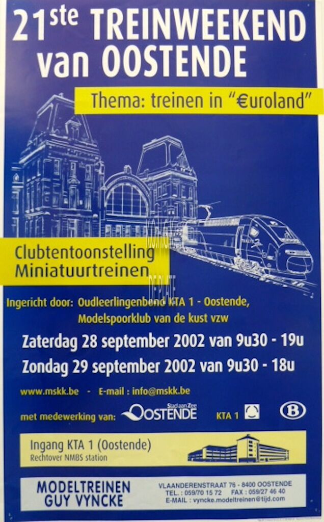 Formaat : 48 x 31 cm. Thema : Treinen in "Euroland". Clubtentoonstelling miniatuurtreinen. Ingericht door : Oudleerlingenbond KTA 1 - Oostende en Modelspoorklub van de Kust.
