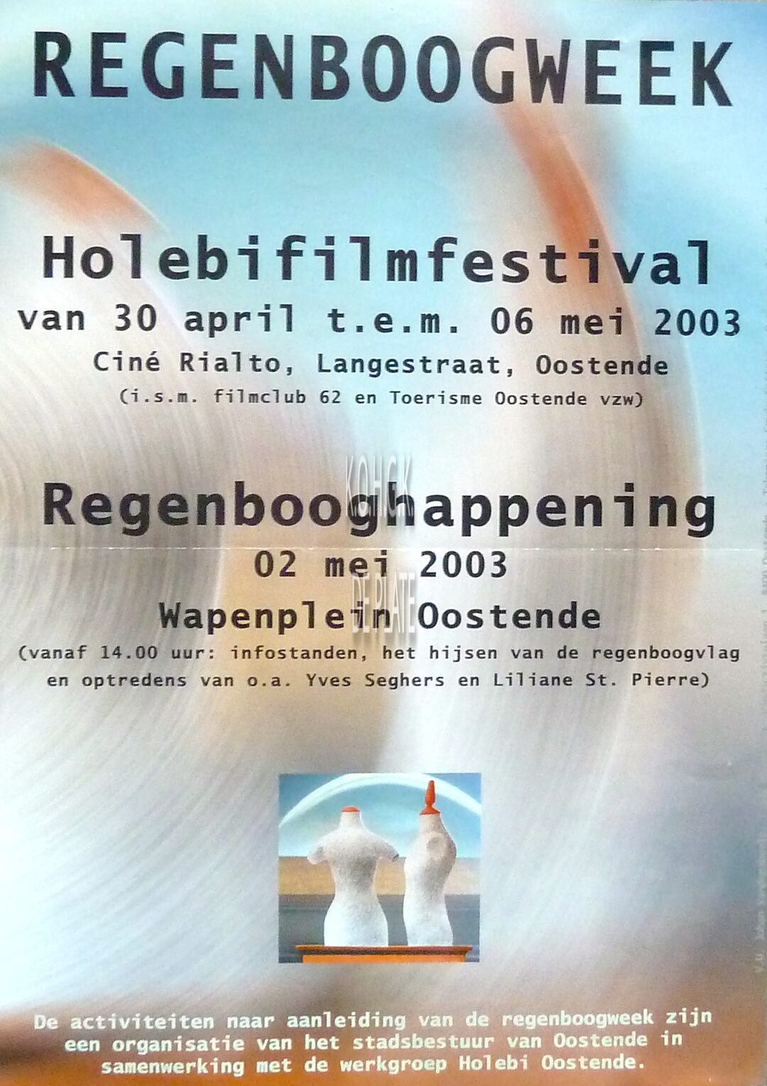 Formaat : 42 x 30 cm. Holebifilmfestival. Ciné Rialro, Langestraat, Oostende. (i.s.m. filmclub 62 en Toerisme Oostende). Regenbooghappening. Wepenplein Oostende. Infostanden, het hijsen van de regenboogvlag en optredens van o.a. Yves Seghers en Liliane St. Pierre. Tekening : Erwin Cattoor. Ontwerp : Jeroen Carrein.