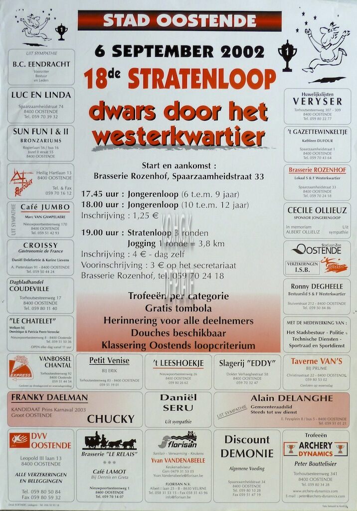 Formaat : 50 x 35 cm. 18de stratenloop dwars door het Westerkwartier. Start en aankomst : Brasserie Rozenhof, Spaarzaamheidstraat 33. 17.45: Jongerenloop (6 t.e.m. 9 jaar). 18.00 uur: Jongerenloop (10 t.e.m. 12 jaar). Inschrijving: 1,25€. 19.00 uur: Stratenloop 3 ronden. Jogging 1 ronde= 3,8 km. Inschrijving: €4 - dag zelf. Voorinschrijving: €3 op het secretariaat Brasserie Rozenhof. Trofeeën per categorie. Gratis tombola. Herinnering voor alle deelnemers. Douches beschikbaar. Klassering Oostends loopcriterium.