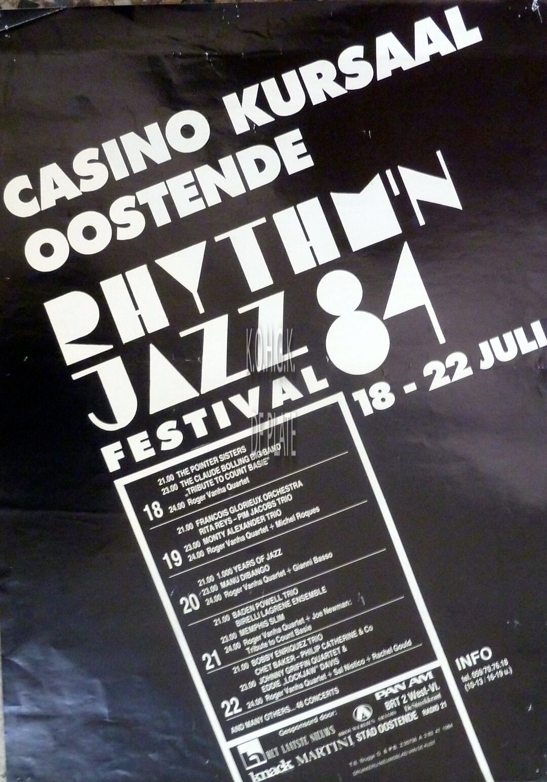 Formaat : 60 x 43 cm. - 18 juli : The Pointer Sisters, The Claude Bolling Big Band "Tribute to Count Basie", Roger Vanha Quartet. 19 juli : François Glorieux Orchestra, Rita Reys - Pim Jacobs Trio, Monty Alexander Trio, Roger Vanha Quartet + Michel Roques. 20 juli : 1000 Years of Jazz, Manu Dibango, Roger Vanha Quartet / Gianni Basso. 21 juli : Baden Powell Trio, Birelli Lagrene Ensemble, Memphis Slim, Roger Vanha Quartet + Joe Newman : Tribute to Count Basie. 22 juli : Bobby Enriquez Trio, Chet Baker - Philip Catherine & Co, Johnny Griffin Quartet & Eddie "Lockjaw" Davis, Roger Vanha Quartet + Sal Nistico + Rachel Gould