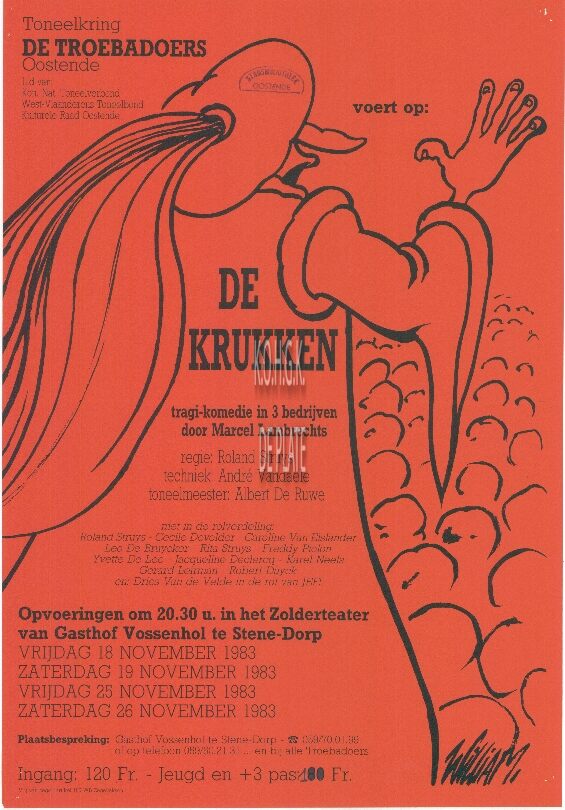 Tragi-komedie in 3 bedrijven door Marcel Lambrechts. Regie: Roland Struys. Techniek: André Vandaele. Toneelmeester: Albert De Ruwe. Met in de rolverdeling: Roland Struys, Cecile Devolder, Caroline Van Elslander, Leo De Bruycker, Rita Struys, Freddy Piolon, Yvette De Lee, Jacqueline Declercq, Karel Neels, Gerard Leirman, Robert Duyck en Dries Van de Velde in de rol van JEF!
