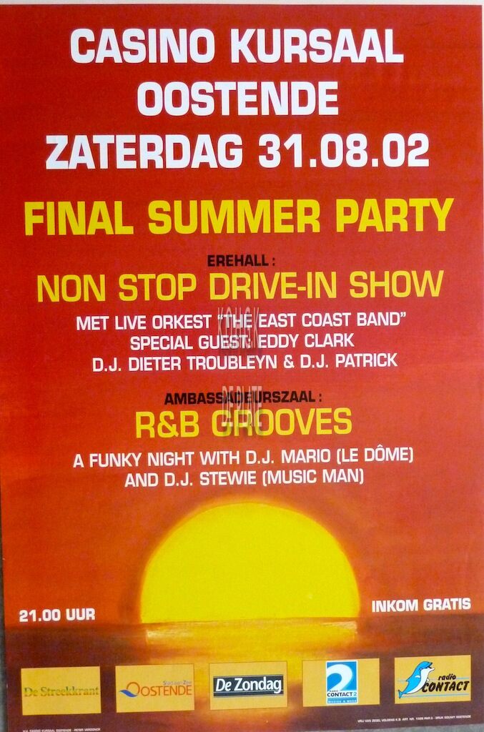 Affiche : 60 x 40 cm. Erehall: Non Stop Drive-in Show met live orkest "the east coast band". Special Guest: Eddy Clark. D.J. Dieter Troubleyn & D.J. Patrick. Ambassadeurszaal: R&B Grooves. A Funky night with D.J. Mario (Le Dôme) and D.J. Stewie (Music Man)