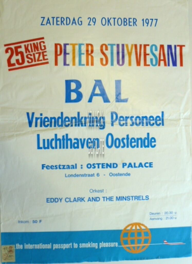 Formaat : 61 x 44 cm. Feestzaal : Ostend Palace. Londenstraat 6, Oostende. Prkest : Eddy Clark and The Minstrels. 25 king Size Peter Stuyvesant. The international passport to smoking pleasure