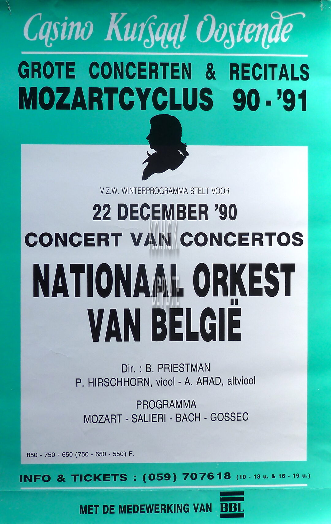 Formaat : 63 x 40 cm. - Deel van de Mozartcyclus 90-91 (v.z.w. Winterprogramma). Dir.: B. Priestman. P. Hirschhorn, viool ; A. Arad, altviool
