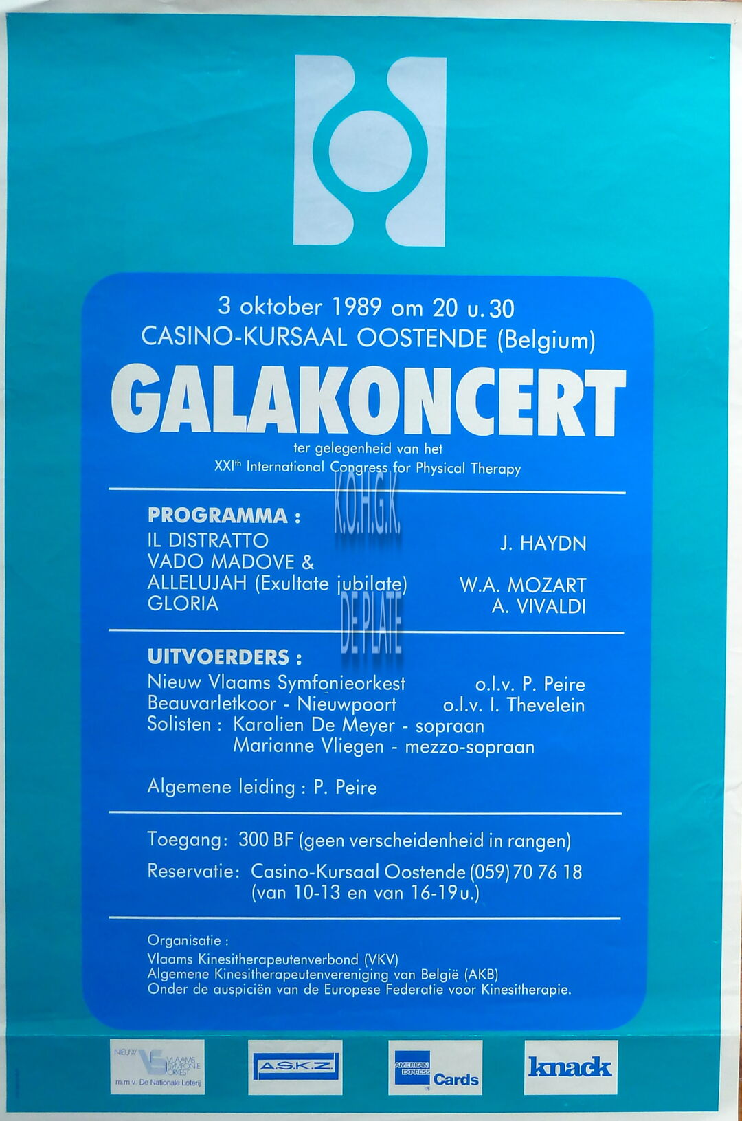 Formaat : 60 x 40 cm. - Ter gelegenheid van het XXIth International Congress for Physical Therapy. - Uitvoerders : Nieuw Vlaams Symfonieorkest o.l.v. P. Peire. Beauvarletkoor - Nieuwpoort o.l.v. L. Thevelein. Solisten: Karolien de Meyer - sopraan, Marianne Vliegen - mezzo-sopraan. Algemene leiding: P. Peire