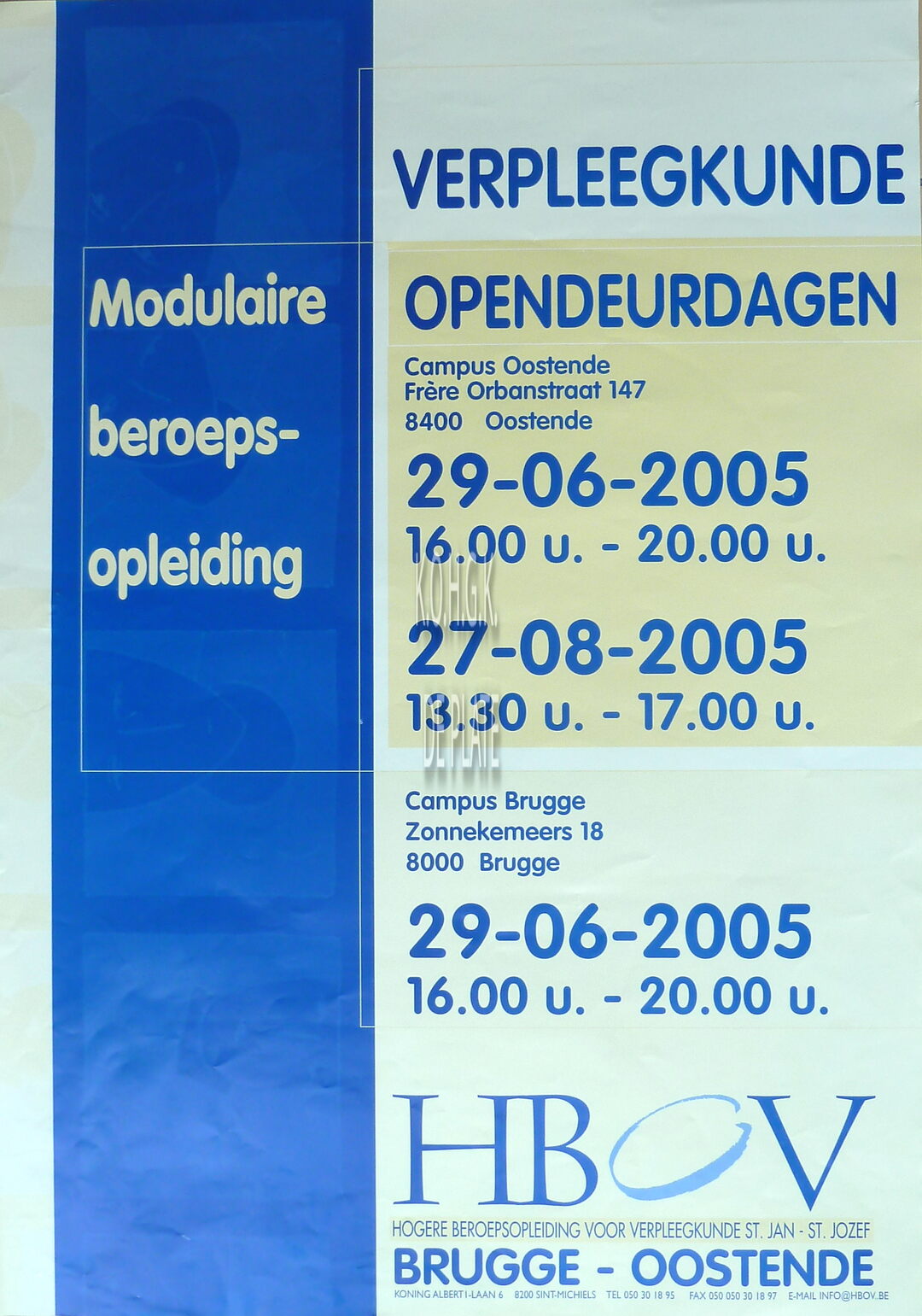 Formaat : 57 x 42 cm. - HBOV. Hogere Beroepsopleiding voor verpleegkunde St. Jan-St.Jozef. Brugge-Oostende. Koning Albert I-laan 6, 8200 Sint-Michiels. Campus Oostende. Frère-Orbanstraat 137, 8400 Oostende. Campus Brugge. Zonnekemeers 18, 8000 Brugge. Modulaire beroepsopleiding