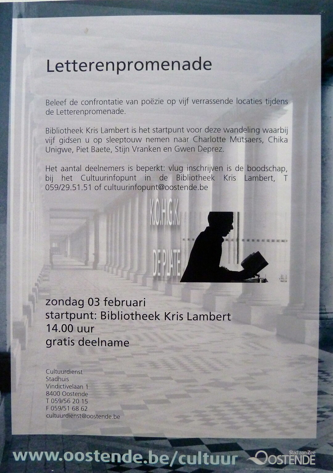 Formaat : 42 x 30 cm. Beleef de confrontatie van poëzie op vijf verrassende locaties tijdens de Letterenpromenade. Bibliotheek Kris Lambert is het startpunt voor deze wandeling waarbij vijf gidsen u op sleeptouw nemen naar Charlotte Mutsaers, Chika Unigwe, Piet Baete, Stijn Vranken en Gwen Deprez.