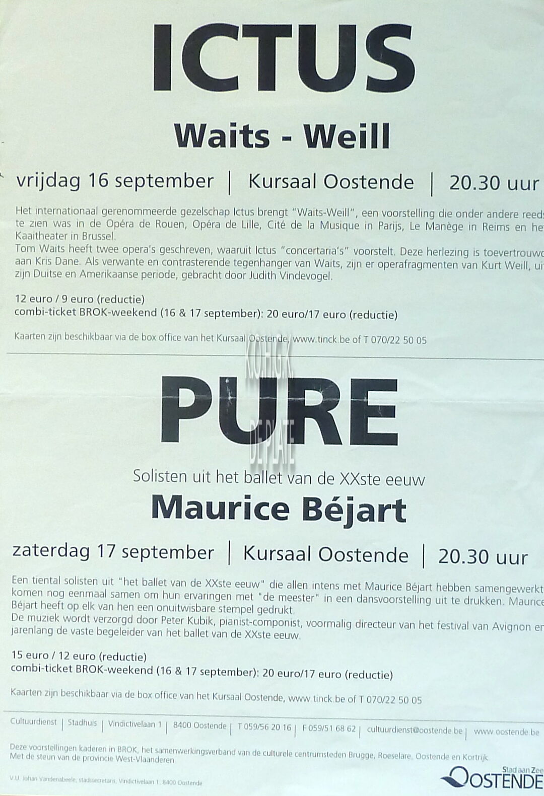 Formaat : 30 x 42 cm. 16/09 : Oorspronkelijke regisseur : Tom Waits. Regisseur : Kris Dane. Oorspronkelijke regisseur : Kurt Weill. Regisseur : Judith Vindevogel. 17/09 : Pianist-componist : Peter Kubik.
