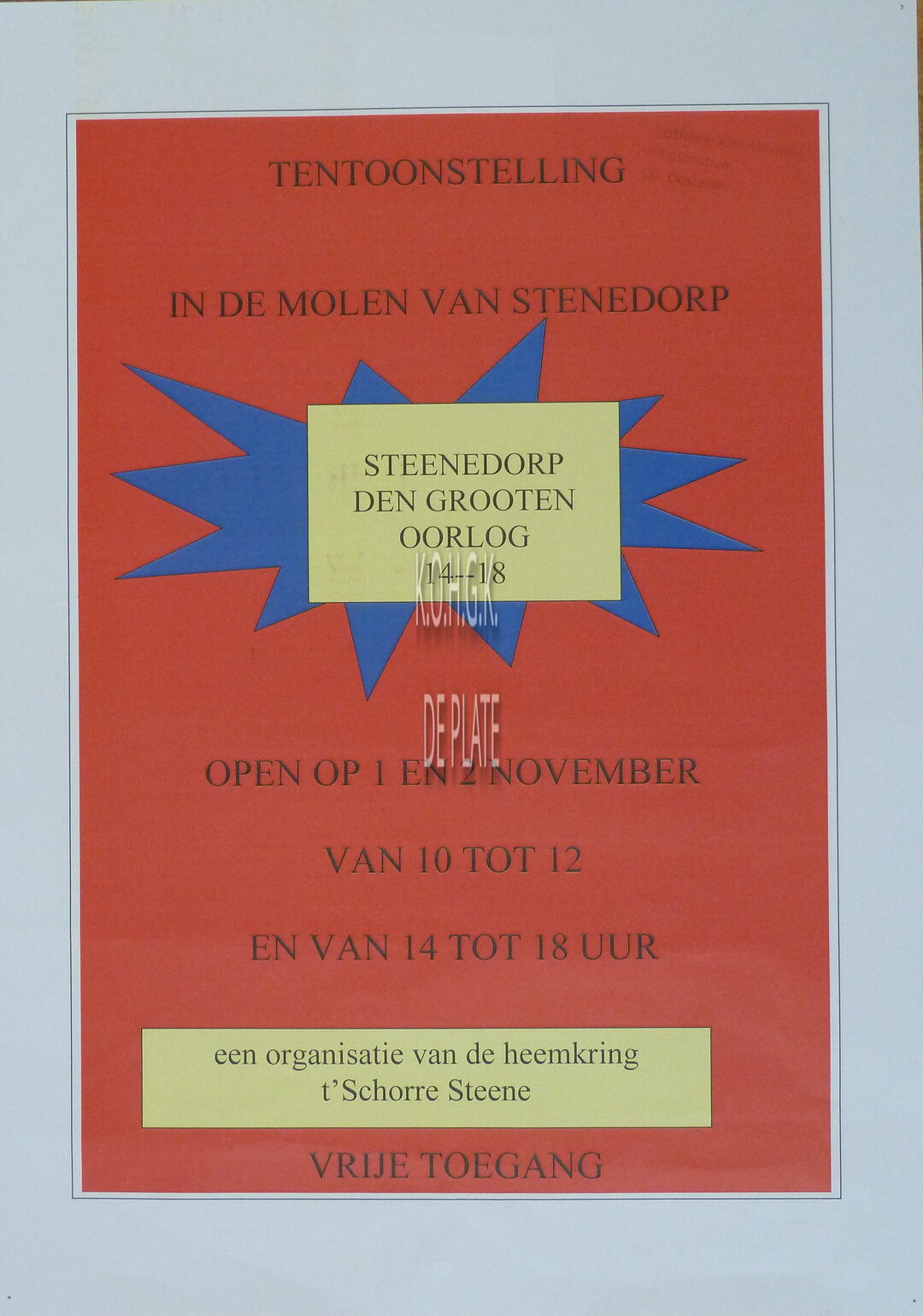 Affiche : Heemkring 't Schorre Steene. Steenedorp den Grooten Oorlog 14-18. Tentoonstelling in de Molen van Stenedorp. 1 en 2 november …. (?)