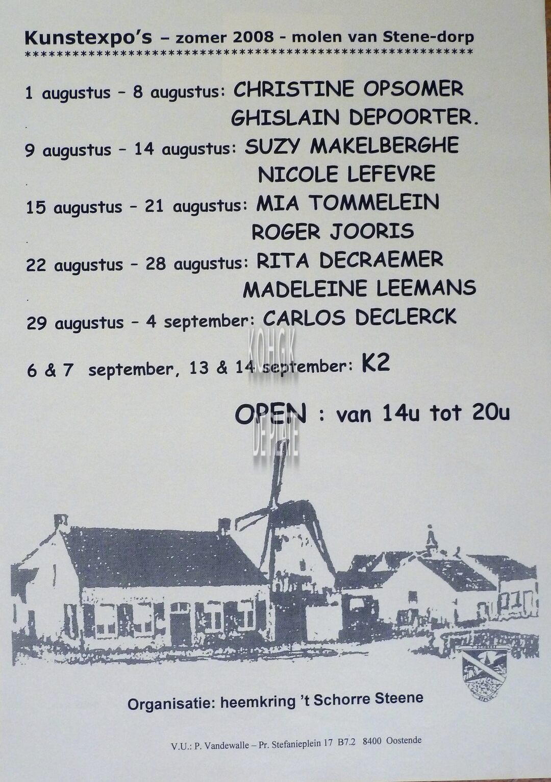 Formaat : 42 x 30 cm. Christine Opsomer, Ghislain Depoorter, 01-08 ; Suzy Makelberghe, Nicole Lefevre, 09-14.08 ; Mia Tommelein, Roger Jooris, 15-21.08 ; Rita Decraemer, Madeleine Leemans, 22-28.08 ; Carlos Declerck, 29.08-04.09 ; K2, 6-7, 13-14.09.2008. - Organisatie Heemkring 't Schorre Steene