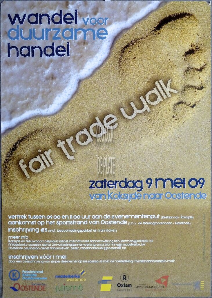 Formaat : 59 x 42 cm. fair trade walk. Vertrek tussen 09.00 en 11.00 uur aan de evenementenput (Zeelaan 303- Koksijde) aankomst op het sportstrand van Oostende (t.h.v. de Wellingtonrenbaan - Oostende). Inschrijving €5. Inschrijven voor 1 mei.
