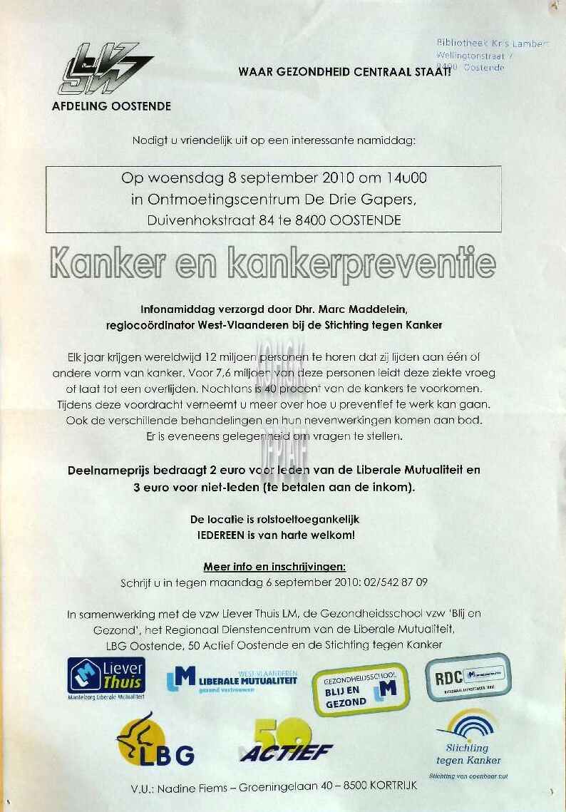 Waar gezondheid centraal staat!. Nodigt u vriendelijk uit op een interessante namiddag : op woensdag 8 september 2010 om 14u00 in Ontmoetingscentrum De Drie Gapers, Duivenhokstraat 84 te 8400 Oostende. KANKER EN KANKERPREVENTIE. Infonamiddag verzorgd door dhr. Marc Maddelein, regicoördinator West-Vlaanderen bij de Stichting tegen Kanker. Deelnameprijs bedraagt 2 euro voor leden van de Liberale Mutualiteit en 3 euro voor niet-leden (te betalen aan de inkom). De locatie is rolstoeltoegankelijk. Iedereen is van harte welkom!. In samenwerking met de vzw Liever Thuis LM, de Gezondheidsschool vzw "Blij en Gezond", het Regionaal Dienstencentrum van de Liberale Mutualiteit, LBG Oostende, 50 Actief Oostende en de Stichting tegen Kanker.