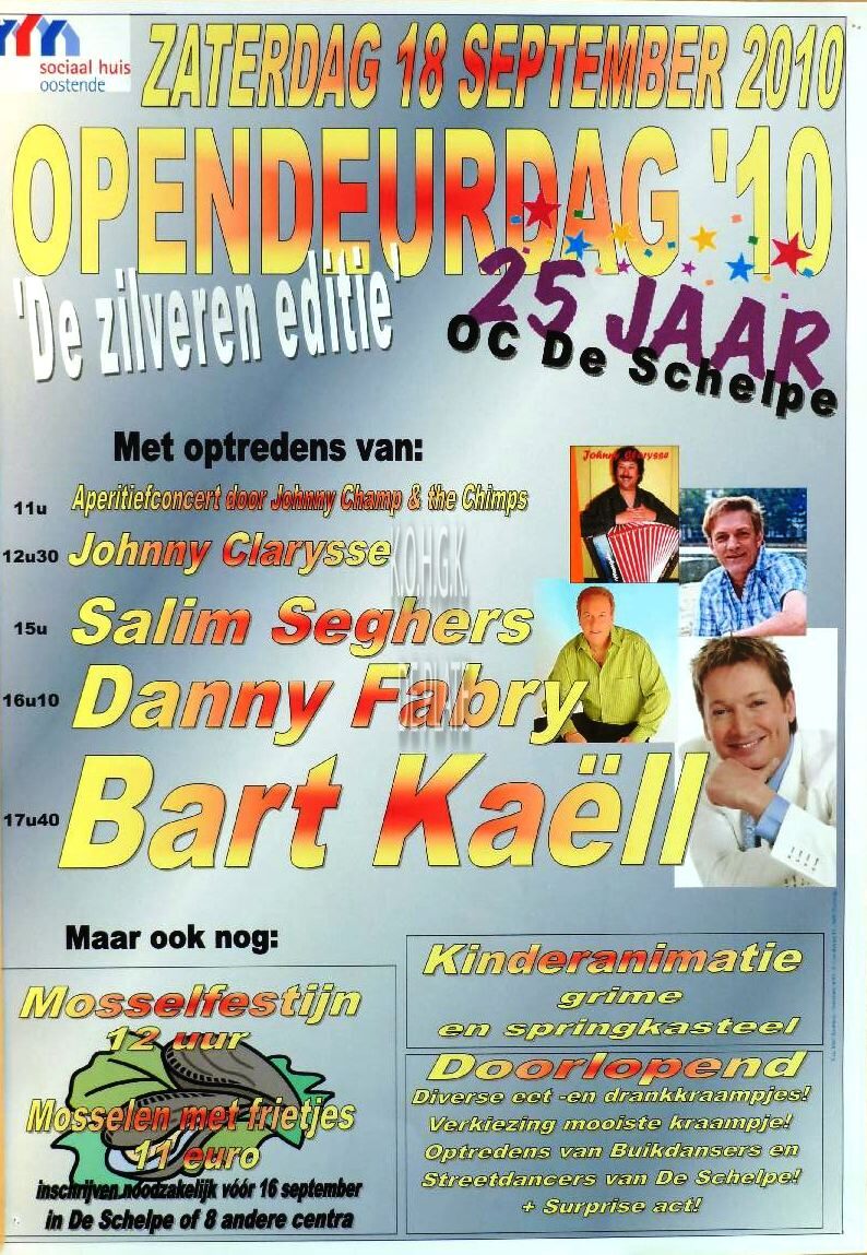 Formaat : 42 x 30 cm. Zaterdag 18 september 2010. Opendeurdag '10. "De zilveren editie". 25 jaar OC De Schelpe. Met optredens van : 11u : Aperitiefconcert door Johnny Champ and the Chimps. 12u30 : Johnny Clarysse. 15u : Salim Seghers. 16u10 : Danny Fabry. 17u40 : Bart Kaëll. Maar ook nog : Mosselfestijn 12 uur. Mosselen met frietjes 11 euro. Inschrijven noodzakelijk voor 16 september in De Schelpe of 8 andere centra. Kinderanimatie, grime en springkasteel. Doorlopend diverse eet- en drankkraampjes!. Verkiezing mooiste kraampje!. Optredens van buikdansers en streetdancers van De Schelpe! plus surprise act!