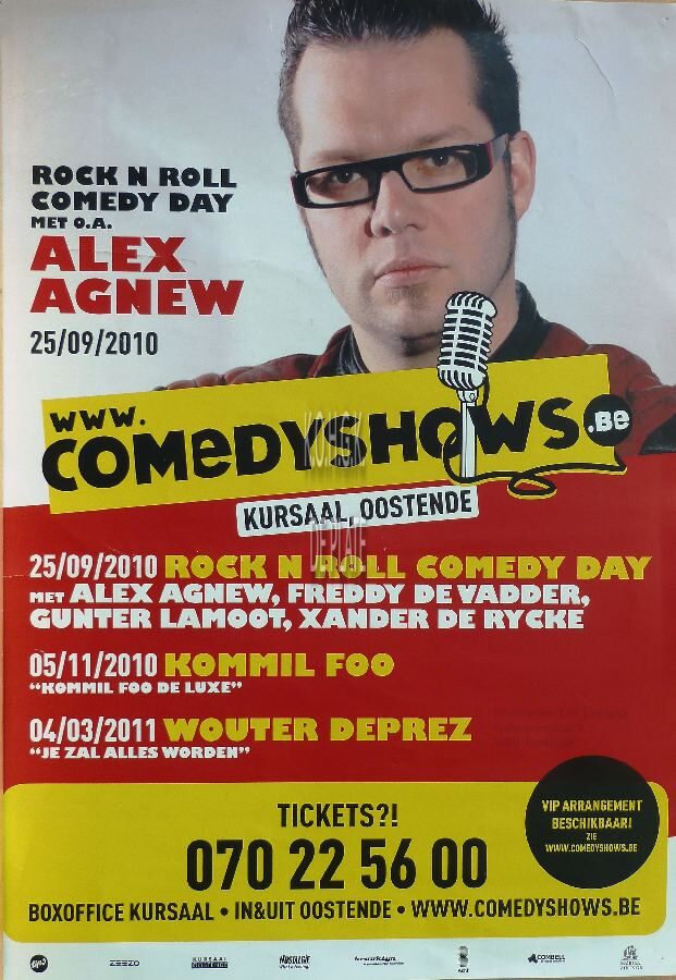 Formaat : 42 x 30 cm. Rock n Roll Comedy Day, met o.a. Alex Agnew, 25/09/2010. www.comedyshows.be. Kursaal, Oostende. 25/09/2010 Rock n Roll Comedy Day met Alex Agnew, Freddy De Vadder, Gunter Lamoot, Xander De Rycke. 05/11/2010 Kommil Foo. "Kommil Foo de Luxe". 04/03/2011 Wouter Deprez. "Je zal alles worden"