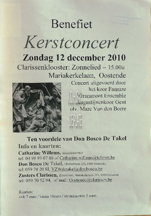 Benefiet. Kerstconcert. Zondag 12 december 2010. Clarissenklooster : Zonnelied, 15.00u, Mariakerkelaan, Oostende. Concert uitgevoerd door het koor Famuze Grammont Ensemble Augustijnenkoor Gent olv. Marc Van den Borre. Ten voordele van Don Bosco De Takel. Info en kaarten : Catharine Willems, initiatiefneemster, Don Bosco De Takel, Elisabethlaan 221, 8400 Oostende, Zusters Clarissen, Zonnelied, Mariakerkelaan 212, 8400 Oostende. Kaarten : vvk 7 euro, kassa 10 euro, steunkaarten 5 euro Formaat : 42 x 30 cm