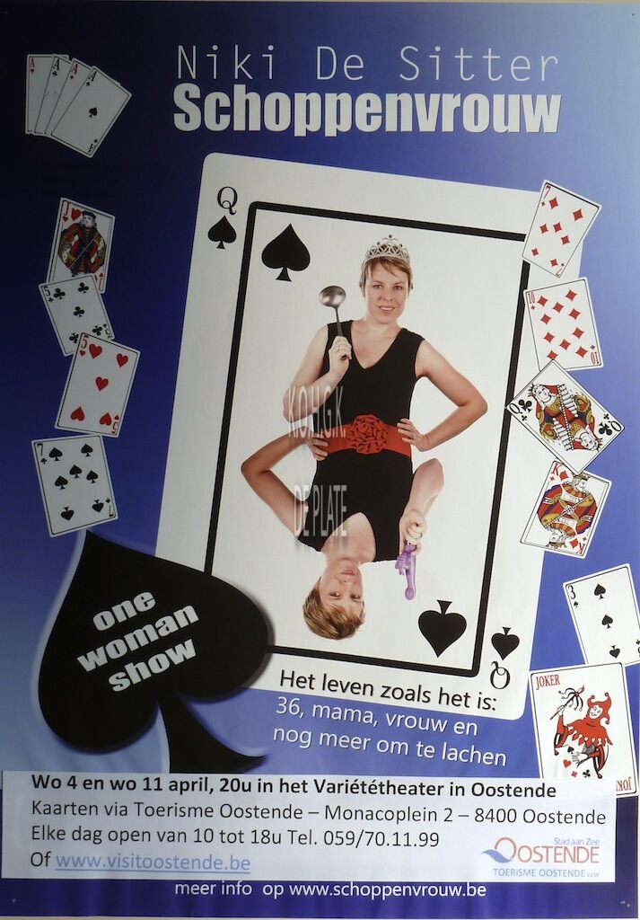Formaat : 42 x 30 cm. One Women show. Het leven zoals het is : 36, mama, vrouw en nog meer om te lachen. www.visitoostende.be www.schoppenvrouw.be