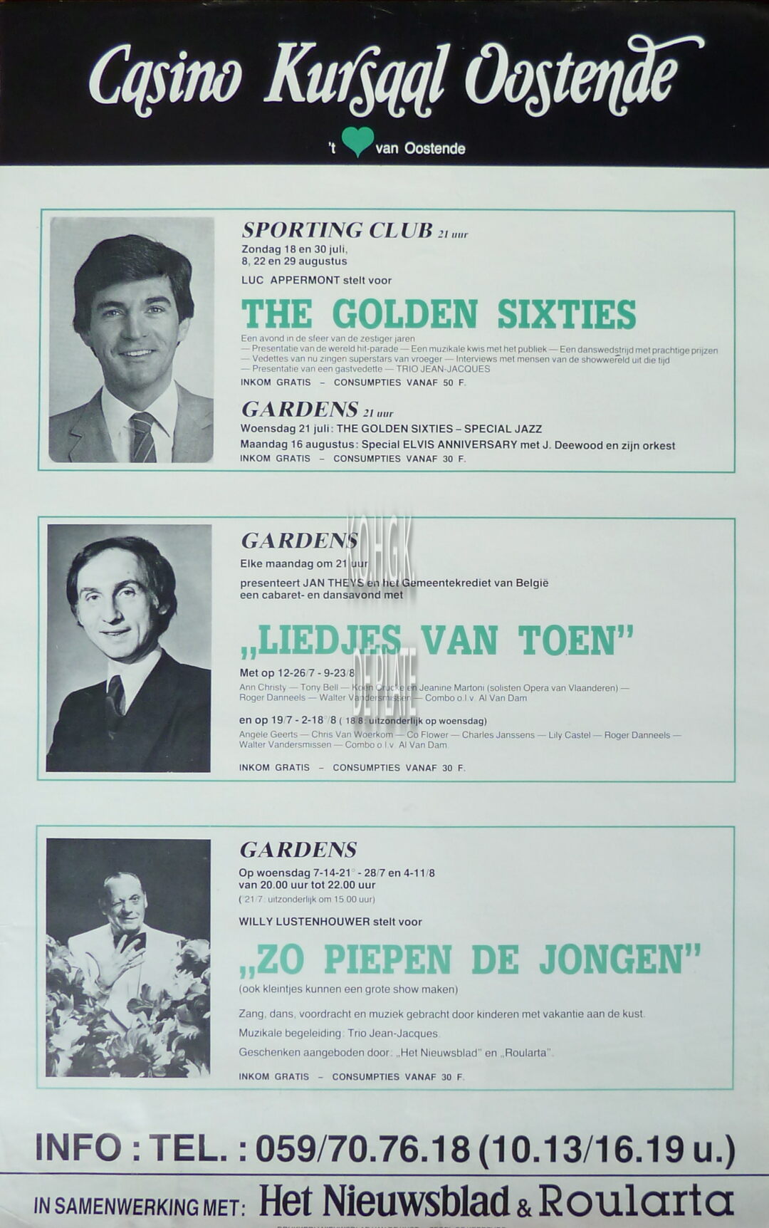 Gardens Elke maandag 21 uur met Jan Theys. Liedjes van toen. 12-26/07 - 9-23/8 en op 19/7 - 2-18/8