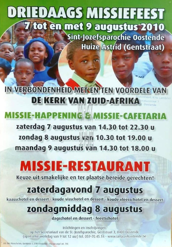 Formaat :42 x 30 cm. Driedaags Missiefeest. 7 tot en met 9 augustus 2010. Sint-Jozefsparochie Oostende. Huize Astrid (Gentstraat). In verbondenheid met en ten voordele van de Kerk van Zuid-Afrika. Missie-Happening en Missie-Cafetaria. Zaterdag 7 augustus van 14.30 tot 22.30 u. Zondag 8 augustus van 10.30 tot 19.00 u. Maandag 9 augustus van 14.30 tot 18.00 u. Missie-Restaurant. Keuze uit smakelijke en ter plaatse bereide gerechten!. Zaterdagavond 7 augustus. Kaasschotel en dessert, koude visschotel en dessert, koude vleesschotel en dessert. Inlichtingen en inschrijvingen : op het secretariaat van de St.-Jozefsparochie, Gentstraat 3, 8400 Oostende (open elke werkdag van 9 tot 12 uur). www.sintjozefoostende.be